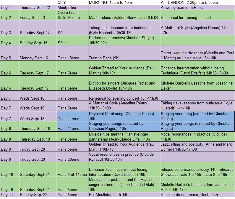 Back in Paris, we had a series of wonderful workshops (thanks to classrooms provided by l’Harmattan publishers) and public concerts. We started with an outdoor dinner at Montmartre. There were two concerts at Lapin Agile, a dinner and show at Forum Léo Ferré; Christian Pagès created an immersive song and movement show at the Salle Olympe de Gouges, and we concluded with the concert directed by Angy at Studio Raspail followed by a wonderful late-night dinner provided by Danielle Mazens. We ended on Sunday at the street dance at rue Mouffetard, until the rain washed us to the café where we held the wrap-up meeting.